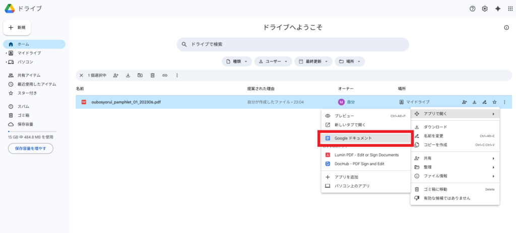 アップロードしたPDFを右クリックし、「アプリで開く」→「Googleドキュメント」を選択します。自動でドキュメント形式に変換されます。